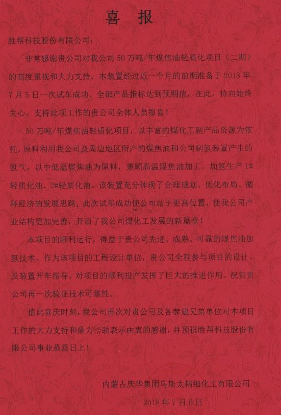 热烈祝贺内蒙庆华公司50万吨/年煤焦油加氢项目试车成功